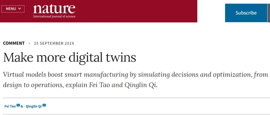 2019年,北航陶飞教授团队受邀在《Nature》杂志发表题为“Make more digital twins"的文章,阐述了数字孪生的概念、技术内涵、应用前景、技术挑战。并在国际上呼吁学术界与工业界要加强合作,共同攻克数字孪生理论技术与应用面临的系列难题,面向行业需求,创造更多的数字孪生(make more digital twins),服务社会和经济发展,促进工业数字化转型和智能化升级【Nature 573, 490-491 (2019) 】。