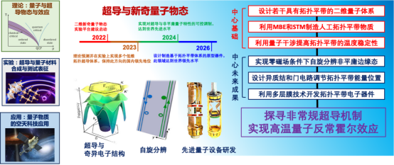 探寻新奇量子物态是凝聚态物理研究和应用的前沿课题,在诸多量子物态中,收到最广泛关注的是两种物态是量子反常霍尔效应和超导。前者使得在零磁场的条件下量子霍尔效应的应用成为可能,后者强大的载流能力可用于制备无能耗的电子器件和提供强磁场。本中心拟在前期的研究基础上,在原有的拓扑材料中引入磁性元素,以及通过异质结或者门电压调控拓扑平带材料的费米能级等方法,实现高温量子反常霍尔效应。同时,利用平带中电子的关联作用,研究强关联情形下,电子之间的相互作用对非常规超导电性的影响,探寻非常规超导机制。